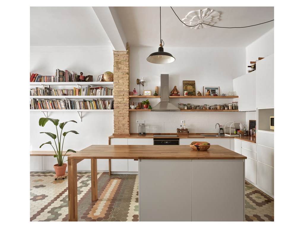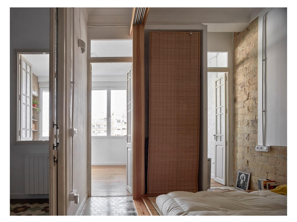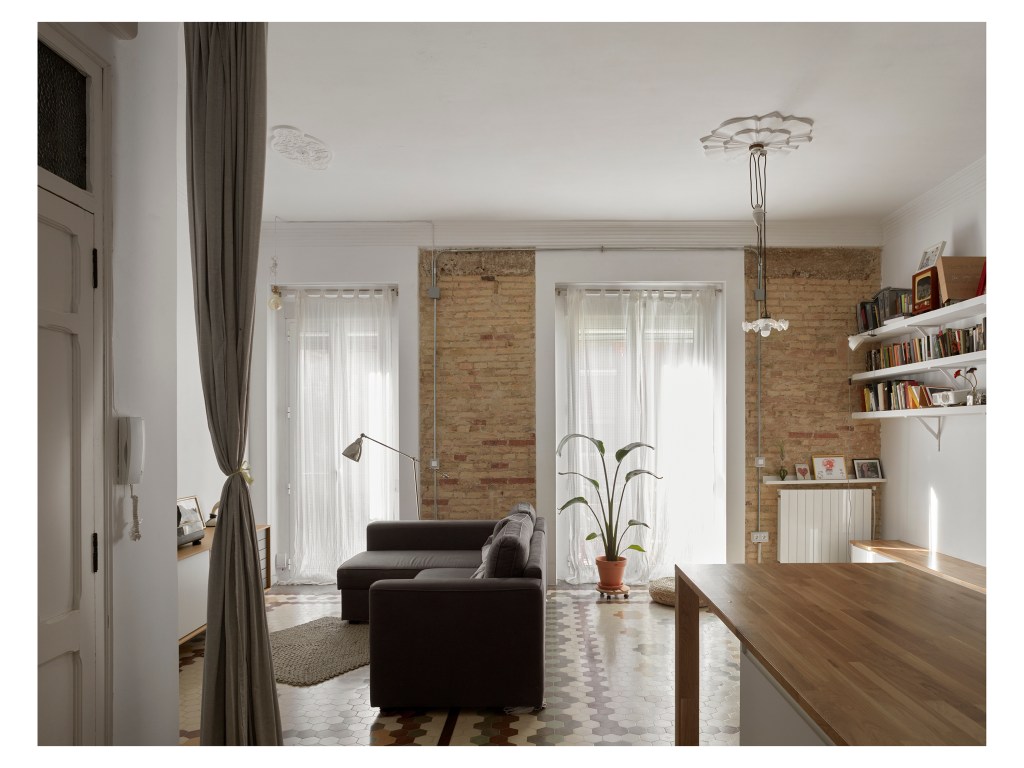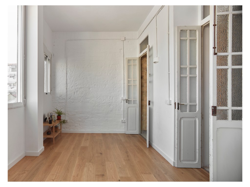 El trabajo de recuperación de los suelos fue muy intenso, incrustando listones de madera en las zonas anteriormente ocupadas por tabiques para mantener dichos tapices de baldosa hexagonal. Del mismo modo, también el trabajo de carpintería fue muy exhaustivo, ya que se restauraron y reutilizaron las puertas originales en distintas ubicaciones de la vivienda, uniéndolas o separándolas entre ellas para adaptarse a los nuevos huecos.